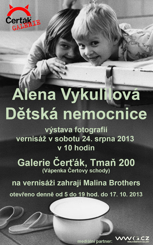 Gelerie Čerťák zve v sobotu 24. srpna 2013 v 10 hodin dopoledne na vernisáž výstavy Aleny Vykulilové s názvem Dětská nemocnice. Ke vzniku výmluvného fotografického souboru přispěl dlouhodobější pobyt autorky ve zmíněném prostředí. Vlastní hospitalizaci fotografka a jihlavská rodačka Alena Vykulilová (1953) využila dokonale. Dlouhodobý pobyt dětí v nemocnici se „teta” z jiného oddělení snažila zpříjemnit tím nejpřirozenějším způsobem – hrou odkoukanou z počínání lékařů a nemocničního personálu. Hra dětí dokáže totiž umenšit bolest a pokrátit čas, než se dostaví do nemocnice rodiče. Fotoaparát vedle vlastního lůžka A. Vykulilovou přitahoval a vybízel rovněž k postižení atmosféry zrodu nového života. Okamžik, kdy sestřičky přinášely novorozence do náručí svých maminek a natrvalo zachycené na filmový pás, patří ke snímkům plných lidského štěstí. Prostředí bílých plášťů bylo pro fotografku impulsem také k návštěvám zdravotnické školy, aby při výuce budoucích sester dokumentovala jejich snažení. Dokázala  přitom objevovat naprosto obyčejné lidské počínání rozpustilých studentek, ale stejně tak vřelý cit a člověčinu. Žena, děti a nemoci. Tři pevné stálice, mezi kterými probíhá život člověka. A. Vykulilová byla v počátcích své tvorby spojena s fotoskupinou OČI, která vznikla na půdě Vysoké školy dopravní v Žilině v roce 1977. Později se stala jednou ze šesti členek snad jediné ženské fotoskupiny na světě FEMINA. Je absolventkou “školičky” u prof. J. Šmoka na pražské FAMU, ale také kurzů v pražském Planetáriu (prof. R. Skopec, ak. malíř Z. Virt, prof. J. Schlemmer, J. Trojan a další). Americké renomované nakladatelství “TIME-LIFE books” vydalo v roce 1983 publikaci věnovanou fotografování dětí od zrodu fotografie až po současnost. Československou fotografii v ní zastupují jen tři autoři – D. Hochová, J. Saudek a A. Vykulilová.