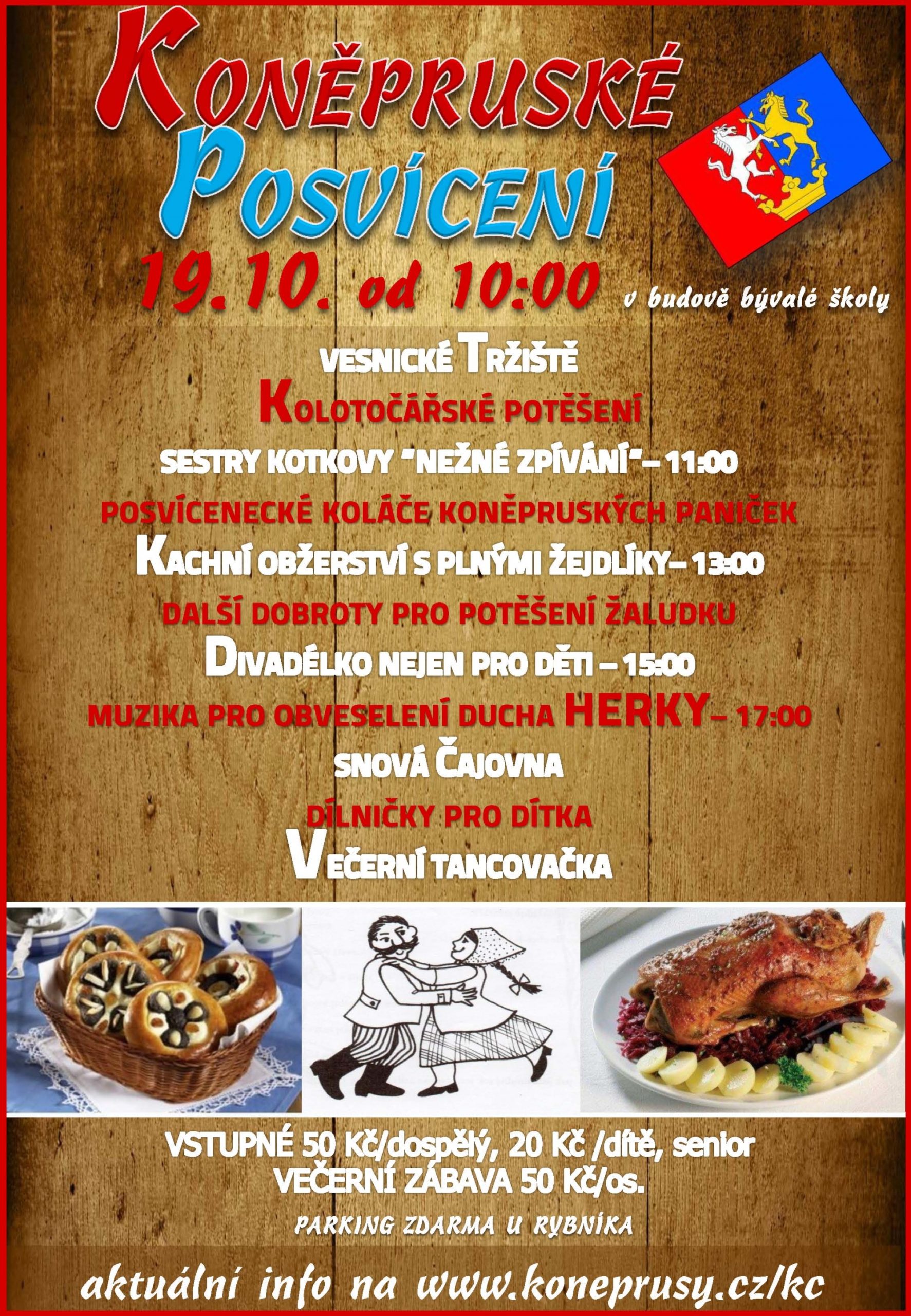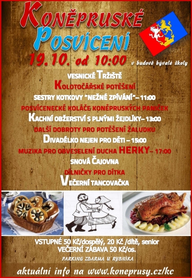 V sobotu 19. října se v obci Koněprusy uskuteční tradiční posvícení. Akce proběhne od 10 hod. v budově bývalé školy. Na programu je vesnické tržiště, kolotočářské potěšení, od 11 hod. je přichystáno „Něžné zpívání“ sester Kortkových. Ve 13 hodin se jedlíci mohou těšit na kachní obžerství s plnými žejdlíky a v 15 hod. je připraveno divadélko (nejen pro děti). V 17 hodin vystoupí kapela Herky a posvícení vyvrcholí tardiční večerní tancovačkou. Aktuální informace k této akci jsou přístupné na www.koneprusy.cz/kc