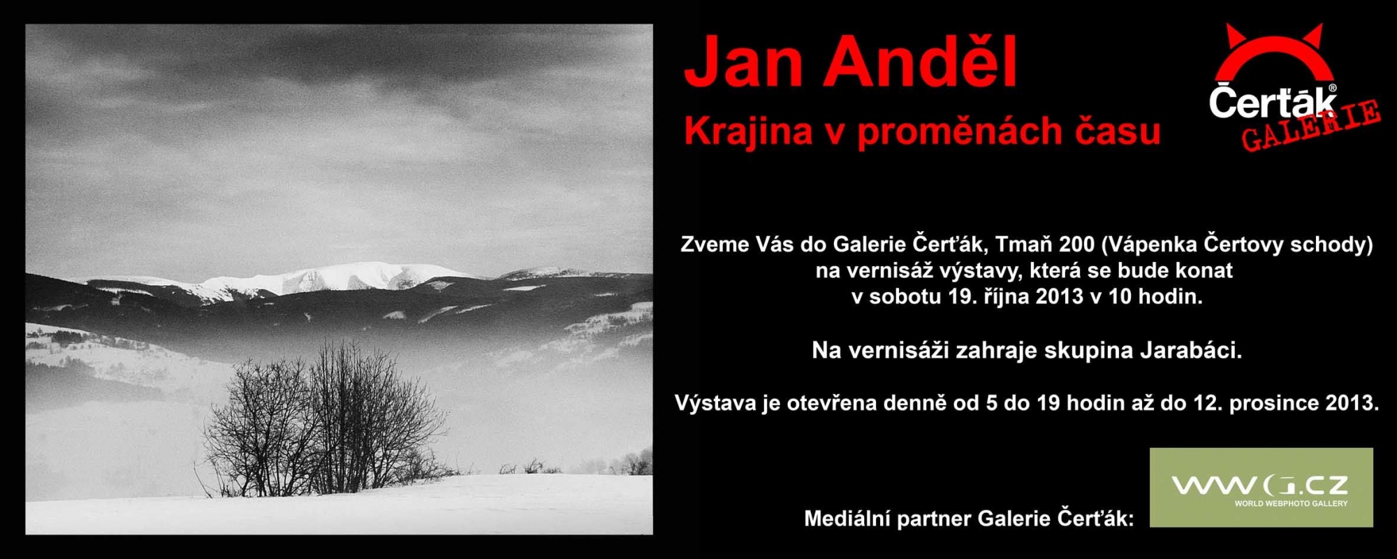 V sobotu 19. října 2013 v 10 hodin dopoledne se v Galerii Čerťák uskuteční vernisáž výstavy Jana Anděla s názvem Krajina v proměnách času. Krajina je, nevezmeme-li v úvahu vnoučky na hrníčku, nepochybně nejčastějším námětem fotografů. Vždyť se jí věnují začínající amatéři, turisté, cestovatelé, dokumentaristé i mnozí další. Krajina jako námět fotografů však také bývá častým předmětem opovržení a přehlížení. Zejména těmi, kteří se jí seriózně nevěnovali nikdy a jsou tedy nezatíženi jakýmikoli zkušenostmi či dokonce znalostmi o fotografii krajiny, občas posměšně tvrdíce, že jde o cosi extrémně snadného a nepohyblivého jako ono příslovečné nádraží. Ostatně, vždyť to přece fotografují amatéři, turisté… Ve skutečnosti, tak jako v jiných oborech fotografie, i ve fotografii krajiny neúprosně platí faktor času. Někdy to mohou být vteřiny či dokonce zlomky vteřin – třeba když se v dramatickém počasí bleskově mění vzhled, osvětlení, světelné efekty. Tehdy fotografovi prostě nezbývá než rezignovat na použití stativu, nebo naopak u stativu trpělivě, dlouho a často marně čekat. Pod zorným úhlem času však také může vznikat historie krajiny. Tady nehrají hlavní roli vteřiny, minuty ani dny, ale roky a desetiletí.