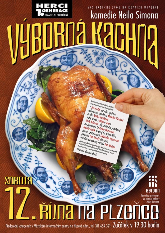 Berounský herecký spolek Herců první generace (HPG) pro velký zájem diváctva reprízuje úspěšnou komedii Neila Simona Výborná kachna. Divadelní představení se uskuteční ve společenském domě Plzeňka v sobotu 12. října od 19:30 hodin. Předprodej vstupenek zajišťuje Městské informační centrum na Husově náměstí (tel.: 311 654 321). V režii Petra Mišiny se představí Jiří George Filip, Katka Horáková, Milan Just, Katka Petrusová, Martin Tuček, Štěpánka Vágnerová a Petr Veselý.