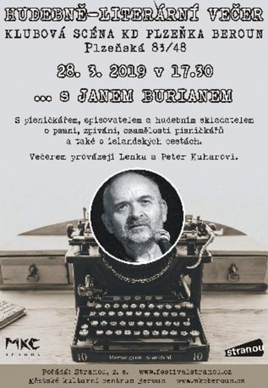 Hudebně-literární večer Stranou v prostoru Kulturní scény KD Plzeňka s písničkářem, spisovatelem a hudebním skladatelem Janem Burianem uvedla a programem provázela Lenka Kuhar Daňhelová. Jan Burian zde zavzpomínal na svého otce, významného českého divadelníka Emila Františka Buriana, společné vystupování s Jiřím Dědečkem a především přiblížil své zážitky z cestování, kde zejména funguje jako průvodce. Zážitky z cest proměnil i do knih Výlet do Portugalska, Cokoliv o Dánsku nebo Dvacet let s Islandem. Dvě hodiny příjemného povídání se konaly v podvečer ve čtvrtek 28. března 2019.