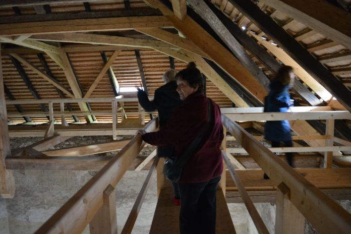 Kastelán Petr Zemánek, projektant Vít Mlázovský i tesař Petr Růžička seznámili návštěvníky s okolnostmi rekonstrukce krovu, zejména s kuriózní skutečností, že stavební práce byly prováděny za pomoci repliky středověkého jeřábu poháněného lidskou silou. Při stavbě repliky jeřábu vycházeli autoři z kresby dobového jeřábu v Bibli Václava IV., který byl také stavebníkem točnického hradu. Na obnovu krovu a stavební úpravy v Královském paláci bylo použito přes 100 kubíků ručně tesaného dřeva.
