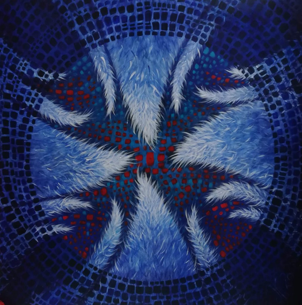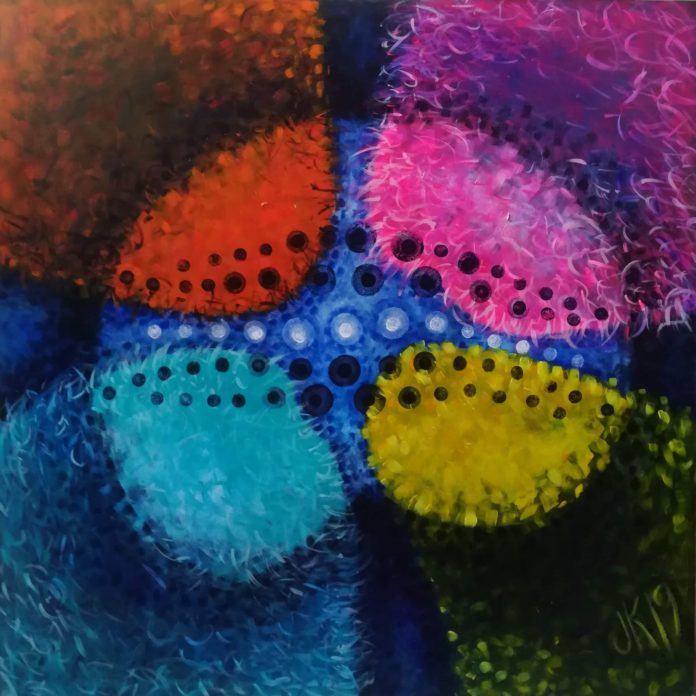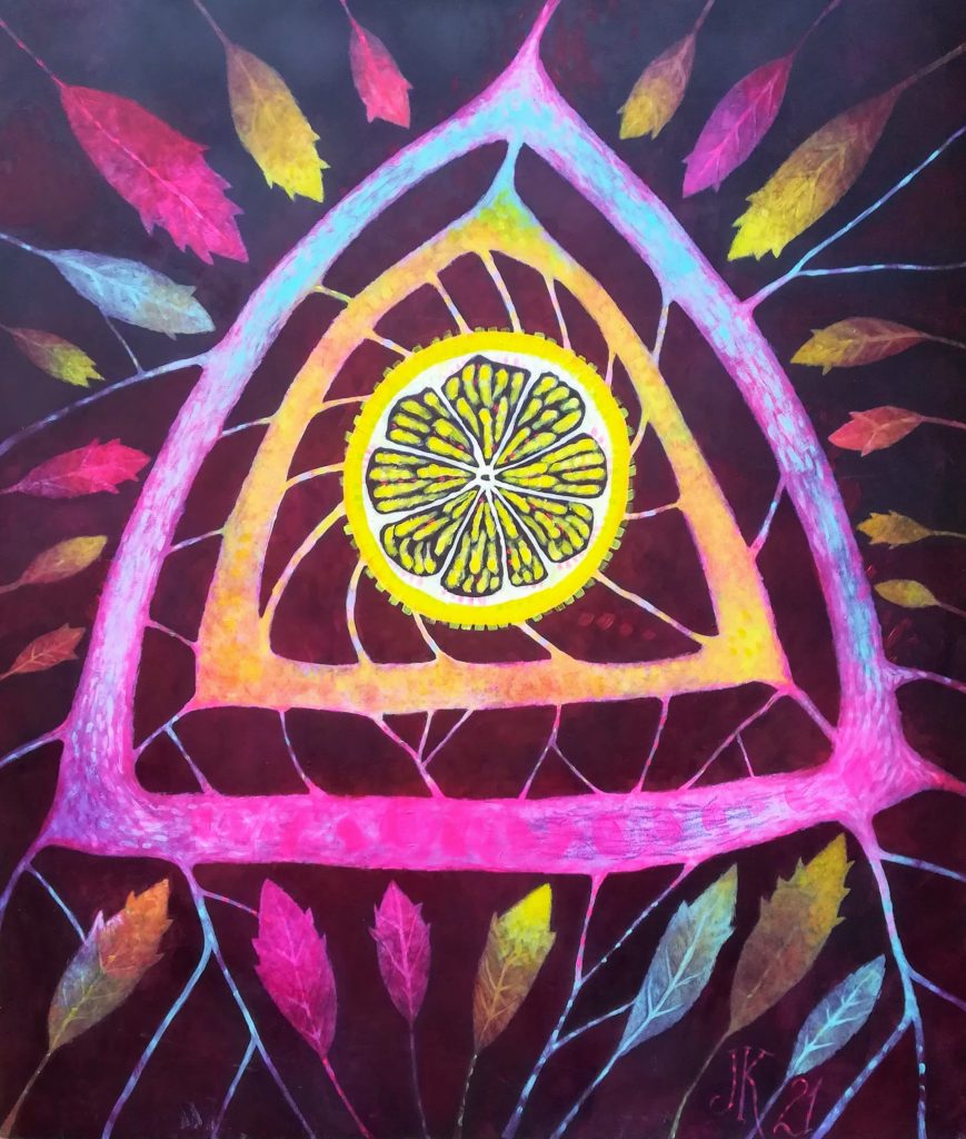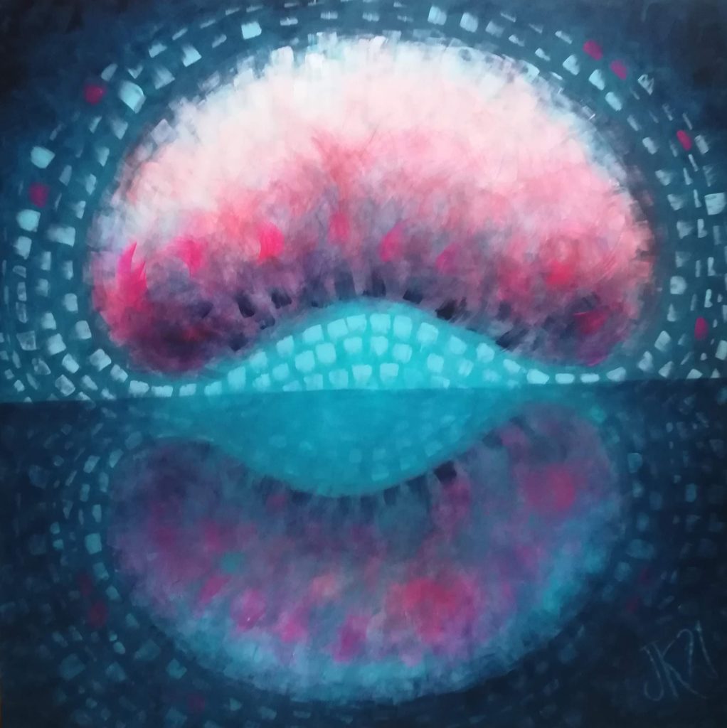 „Téměř všechny obrazy, které dnes visí v Jiné kávě, vznikly totiž v posledních dvou letech. V těch naprosto divných dvou letech, které jsme skoro všichni strávili zavření doma, se svými blízkými, které máme rádi, a hlavně sami se sebou a sebe máme přece nejradši – to dá rozum – to je ten ráj srdce, to vnitřní ztišení, meditace, ve které najdeme konečně spočinutí od labyrintu neklidného světa, všeho mámení, svodů a klamů, falešných pozlátek, přetvářky a nesmyslných požadavků…“ dodává Jana Kubásková, aby následně své představy ještě rozvinula: „Nevím jak vám, ale mě nejsložitějším labyrintem na světě připadá právě to lidské srdce – vrtkavé, nestálé, tápající. Lékaři anatomové taky prominou, ale já si lidské srdce představuju jako labyrint vztahů – vztahů s ostatními lidmi – našimi rodiči, sourozenci, dětmi, přáteli manželi, partnery, dosaďte si, koho chcete… Lidské srdce stále po něčem prahne, a když už si myslí, že to nachází, najednou zjišťuje, že je všechno mnohem složitější, cesty vztahů s našimi blízkými se všelijak zamotávají, kroutí a proplétají. Když se zdá, že jde všechno hladce, najednou se cesty blízkých lidí rozdvojí, někdy se úplně ztratí, aby se někde jinde vynořila nečekaná zkratka. Sami mnohdy nevíme, jestli to, co si přeje naše srdce je opravdu dobře a která cesta vede k cíli, to už je úplná hádanka…“