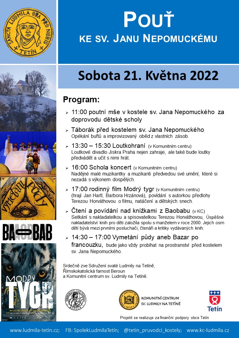 Sdružení sv. Ludmily na Tetíně, Římskokatolická farnost Beroun a Komunitní centrum sv. Ludmily na Tetíně zvou na tradiční Pouť ke sv. Janu Nepomuckému, a to v sobotu 21. května 2022.