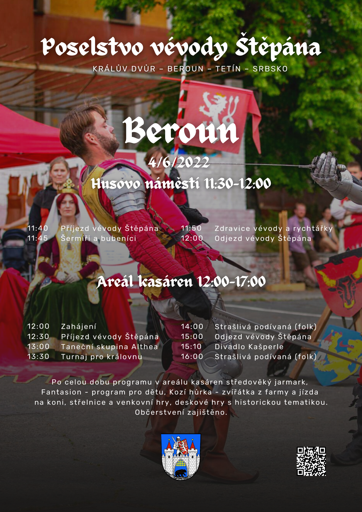 V letošním roce se Poselstvo vévody Štěpána II. Bavorského podruhé zastaví v areálu bývalých kasáren před Městskou knihovnou Beroun, kde bude připraven bohatý program. Děti se mohou těšit na program instruktorů organizace Fantasion, na zvířátka z farmy Kozí hůrka, venkovní i deskové hry, střelnici či divadlo. Na dospělé čeká jarmark, kapela Strašlivá podívaná, turnaj pro královnu či taneční vystoupení skupiny Altea. Zlatým hřebem programu bude příjezd poselstva vévody Štěpána II. Bavorského, kterého opět ztvární Jiří Werich Petrášek.