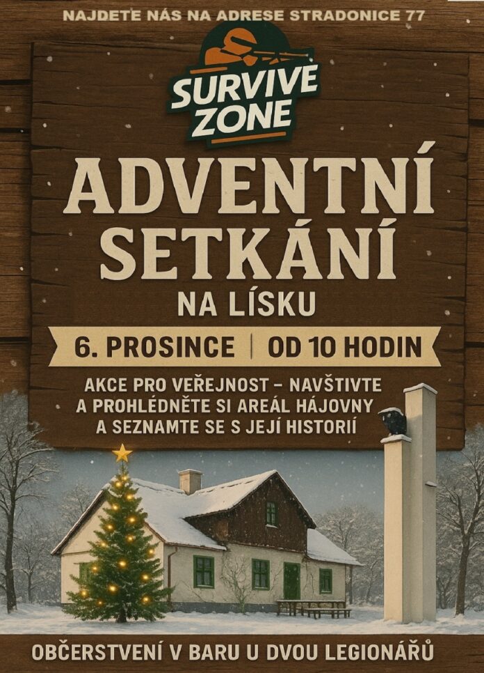 Přijďte strávit adventní čas v jedinečném prostředí Na Lísku. Akce je otevřená pro veřejnost – můžete navštívit a prohlédnout si celý areál bývalé steigrovny a hájovny, projít si místo s bohatou minulostí a seznámit se s jeho historií i dalším rozvojem v rámci Survive Zone. Těšit se můžete na i na Četnickou stanici Hořovice. Občerstvení zajistí bar U dvou legionářů – připravíme pro vás teplé nápoje, dobroty a příjemnou předvánoční atmosféru.