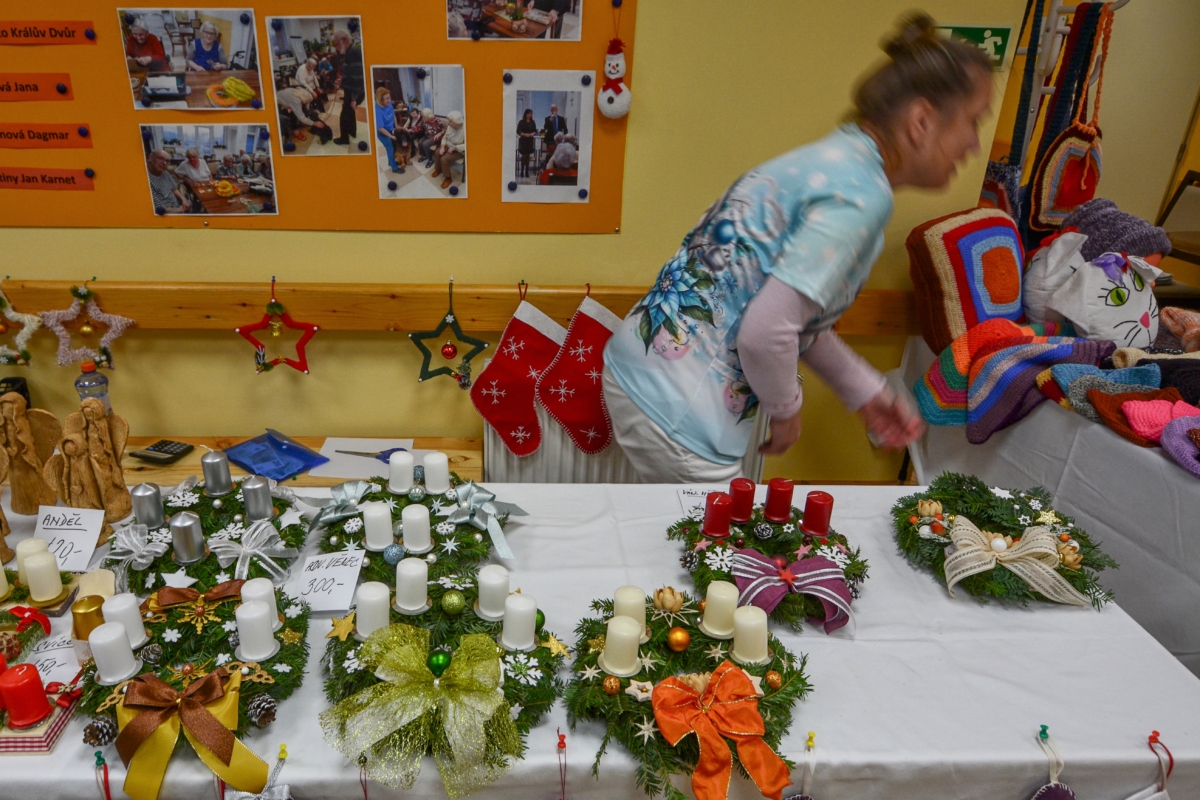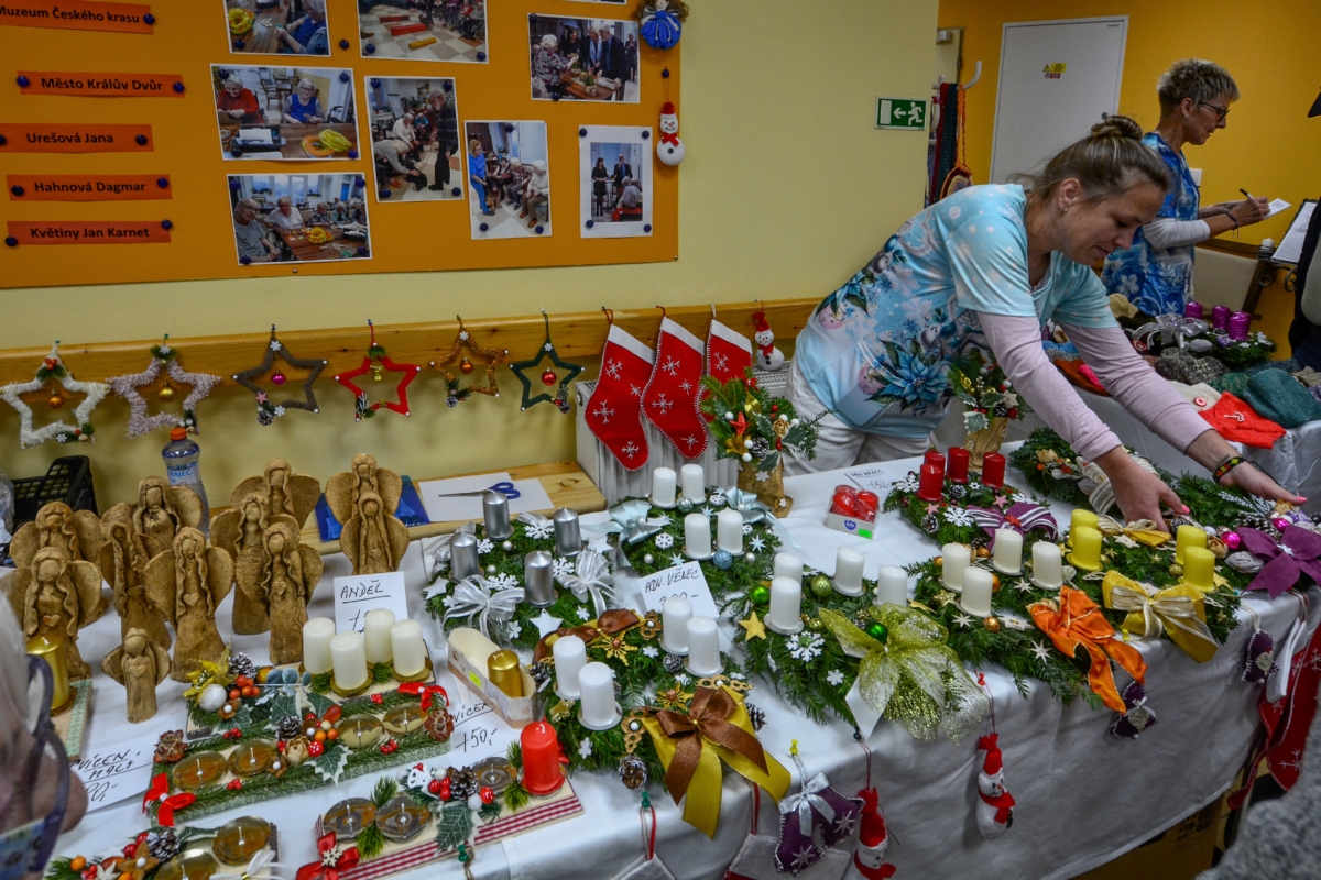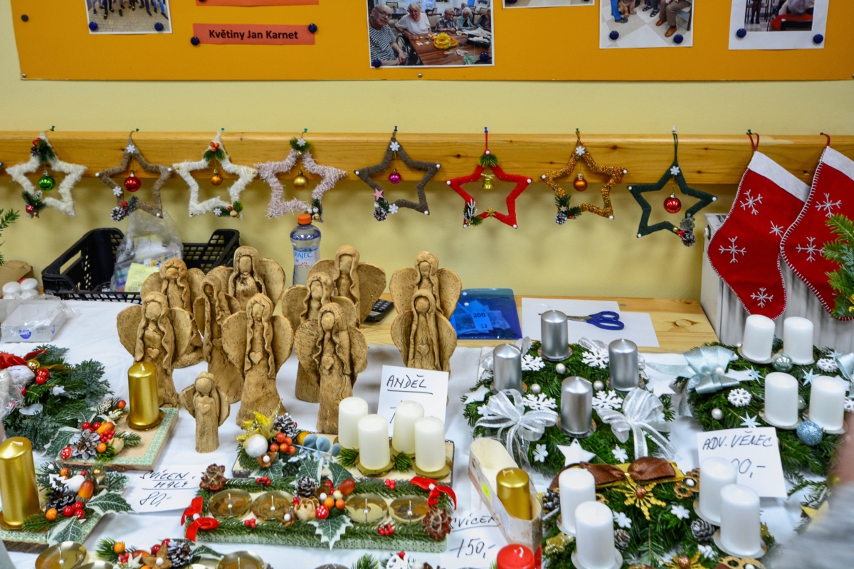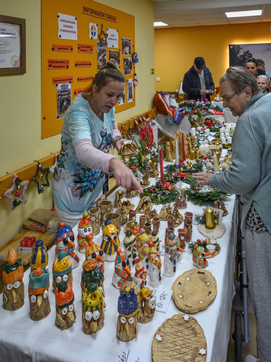 Včera (pátek 28.11.2025) proběhla v Domově seniorů TGM Beroun slavnostní akce pro vlastní klienty, jejich rodinné příslušníky a ostatní přišedší. Odpoledne bylo odstartováno vánočním jarmarkem v prostorách recepce, kde si hosté mohli zakoupit výrobky klientů s vánoční tematikou. Nechyběly pečlivě vytvořené adventní věnce, velké množství keramických výrobků (malé betlémy, andělé a spousty jiných figurek), malé i velké svícny a také široká nabídka různých pletených či háčkovaných výtvorů. Škoda jen, že těch opravdu pěkných věcí se nakonec prodalo poměrně málo